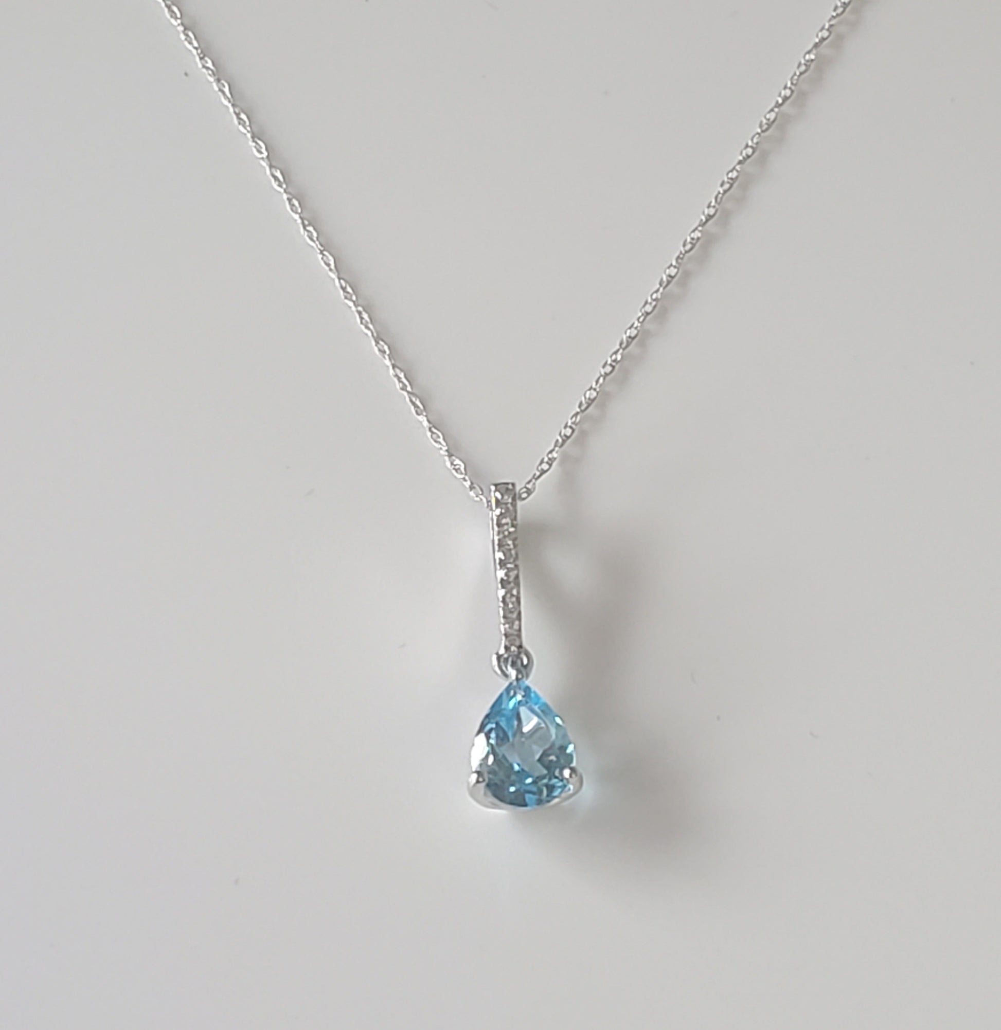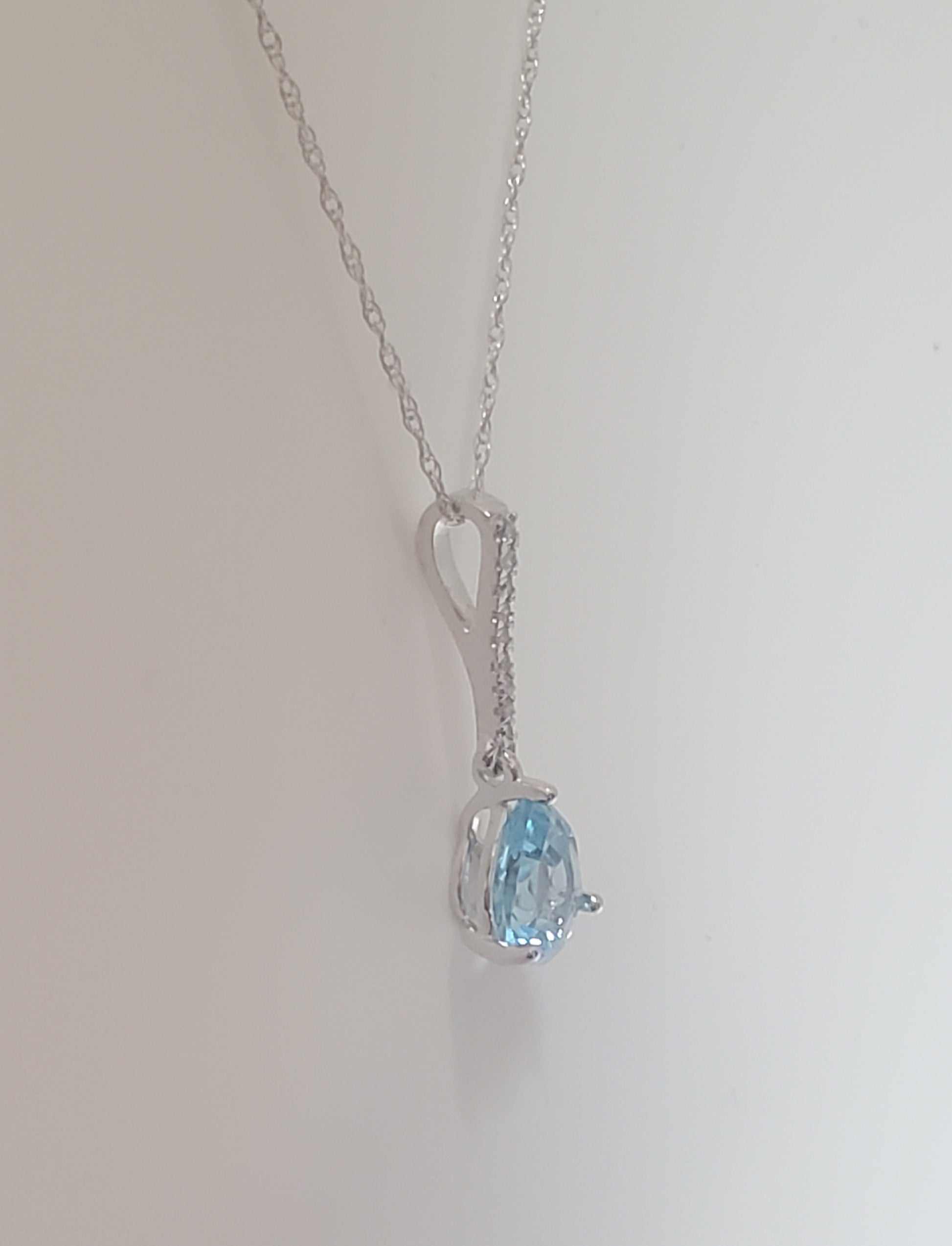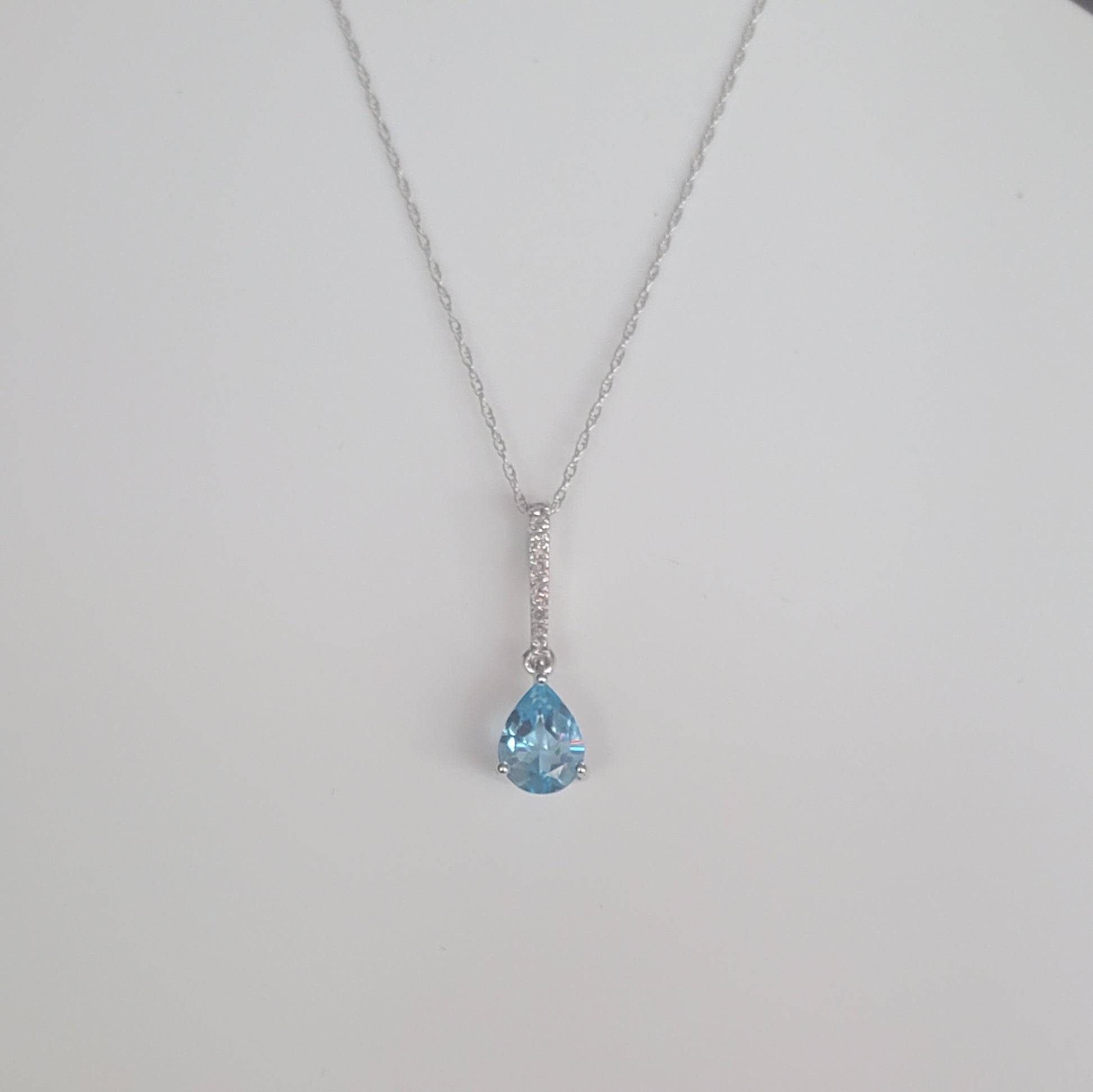10k White Gold Diamond and Blue Topaz Teardrop Pendant with 18" Chain. Diamond weight totaling .05 carats.