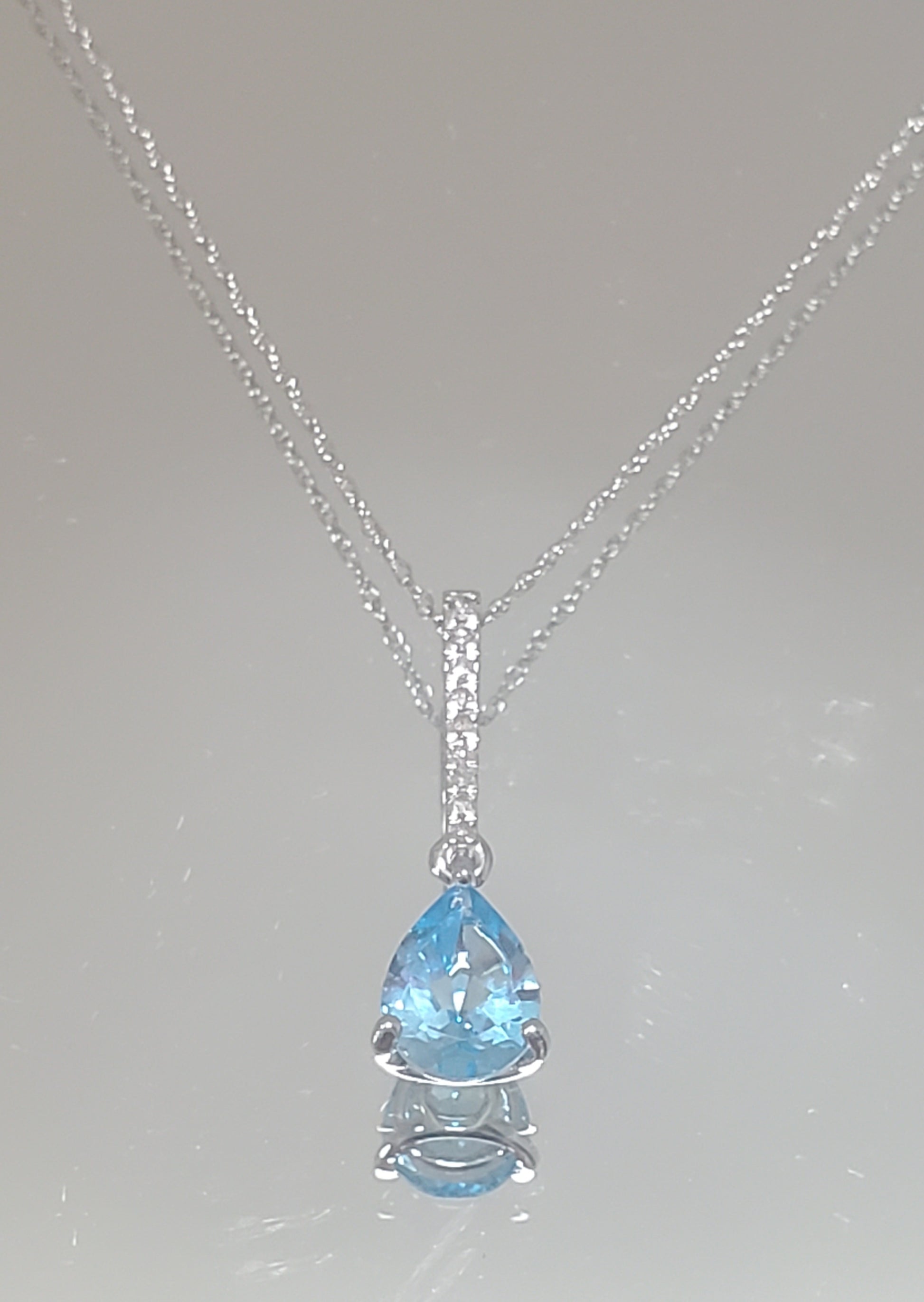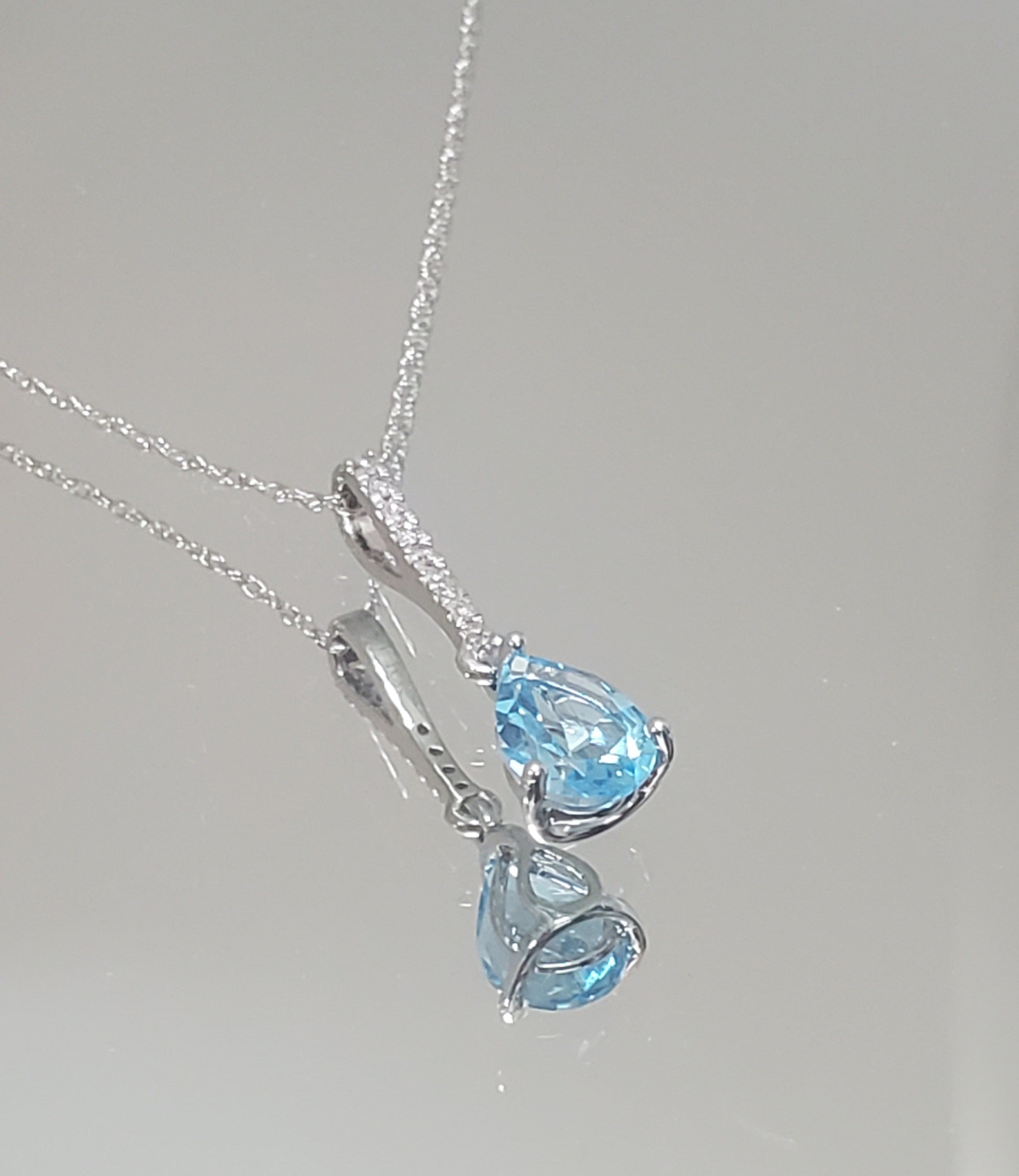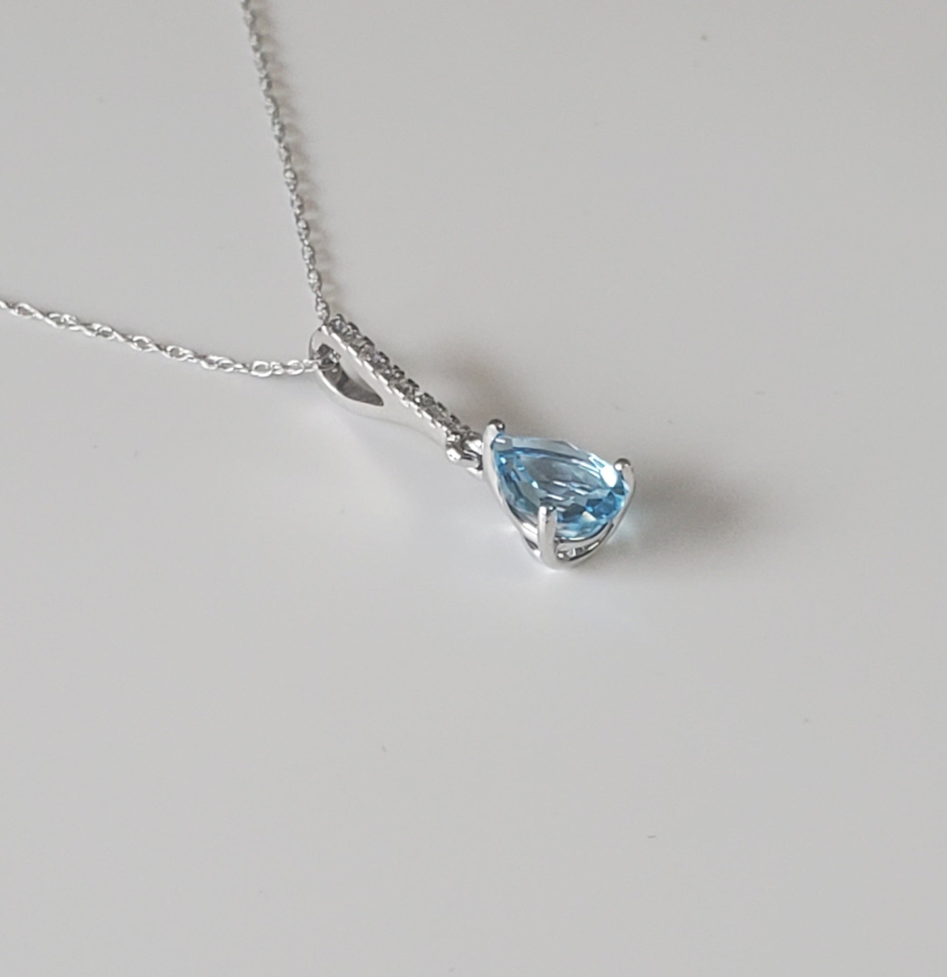 10k White Gold Diamond and Blue Topaz Teardrop Pendant with 18" Chain. Diamond weight totaling .05 carats.
