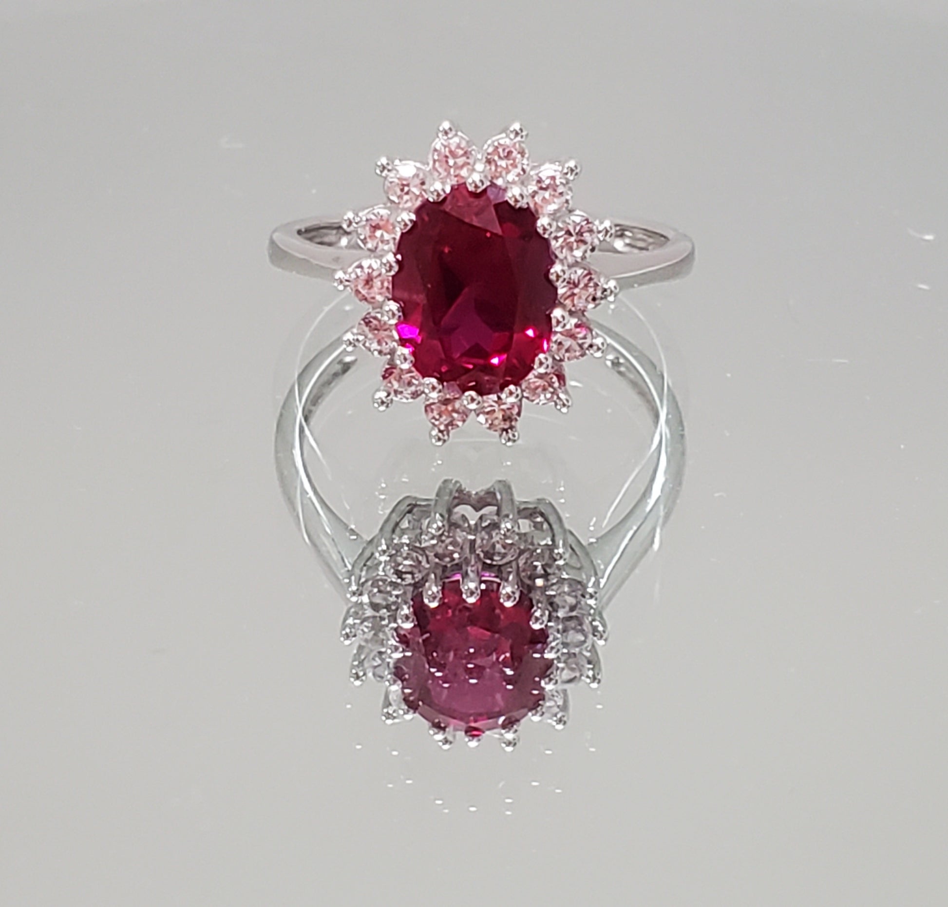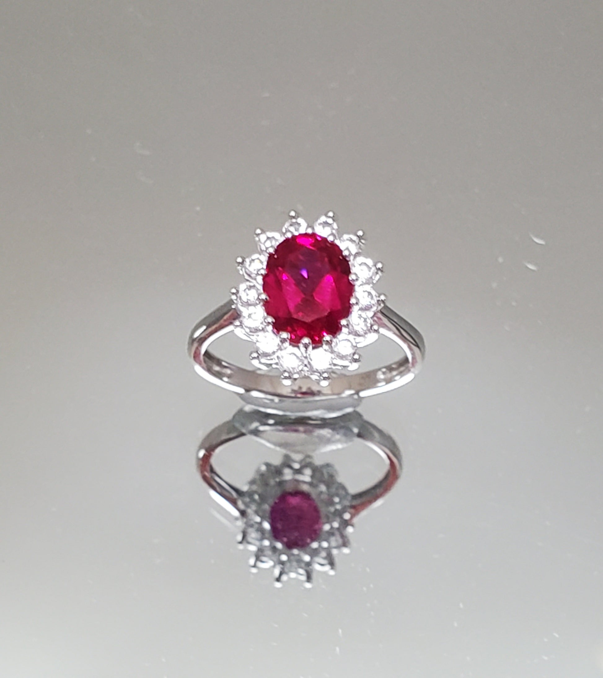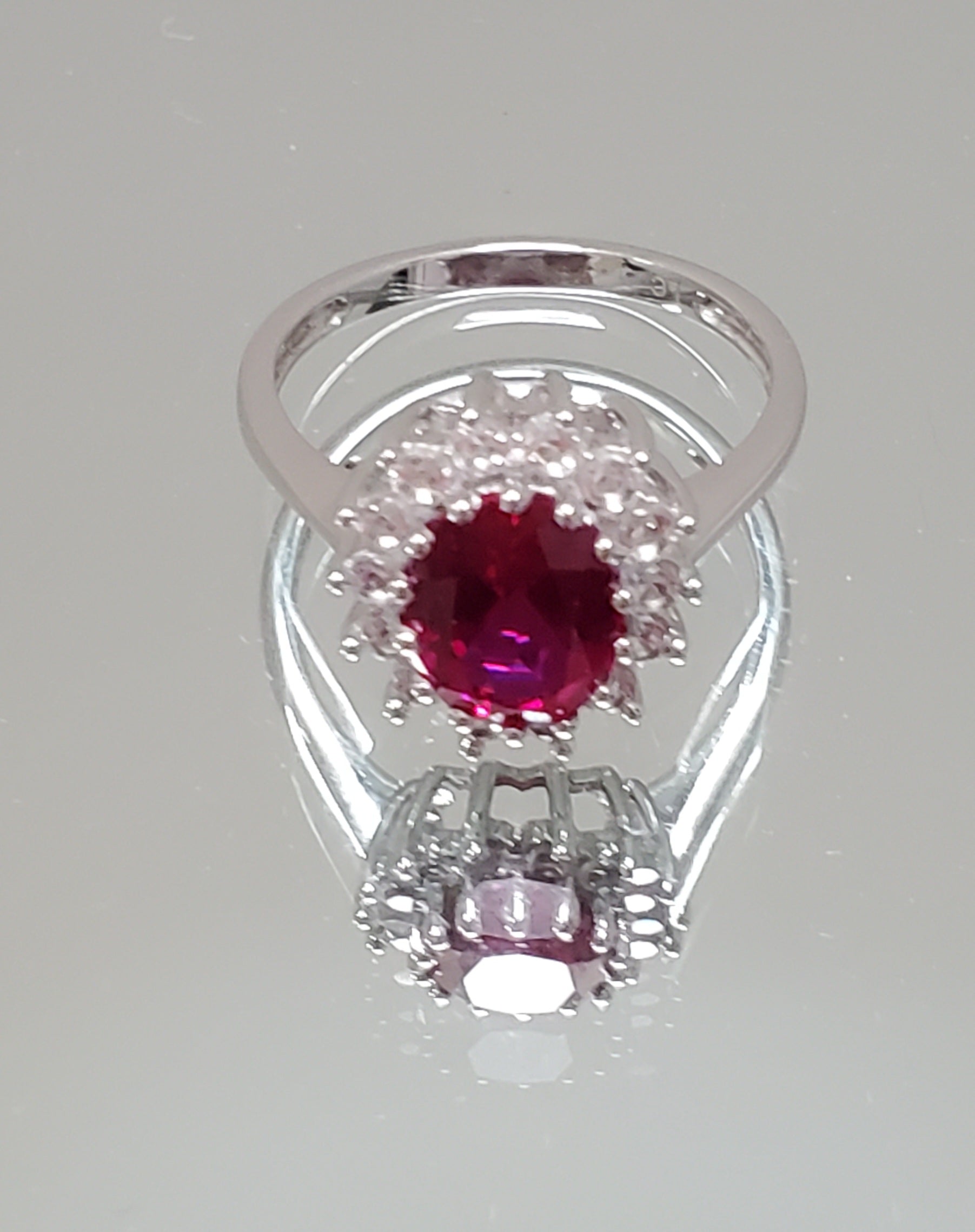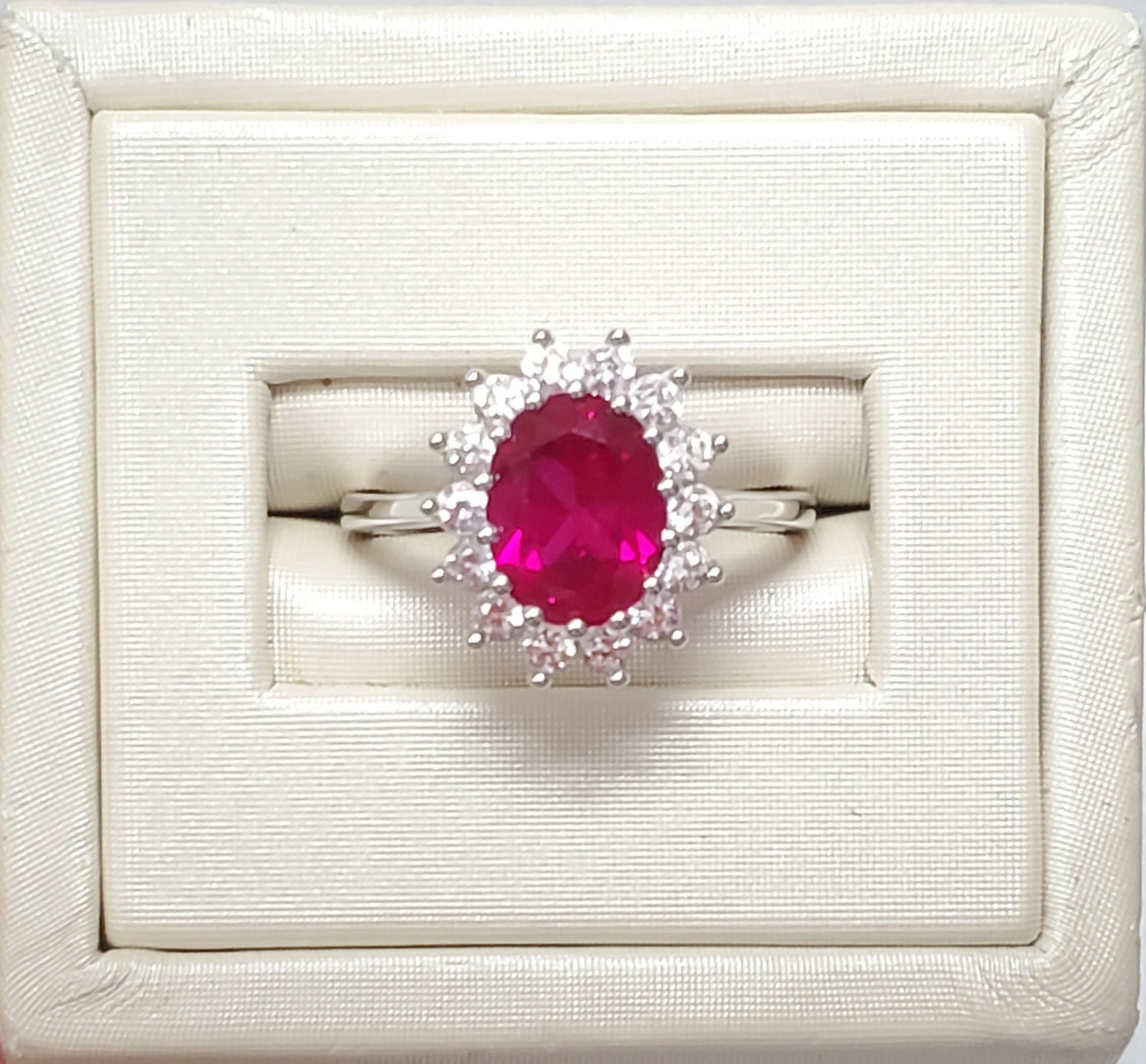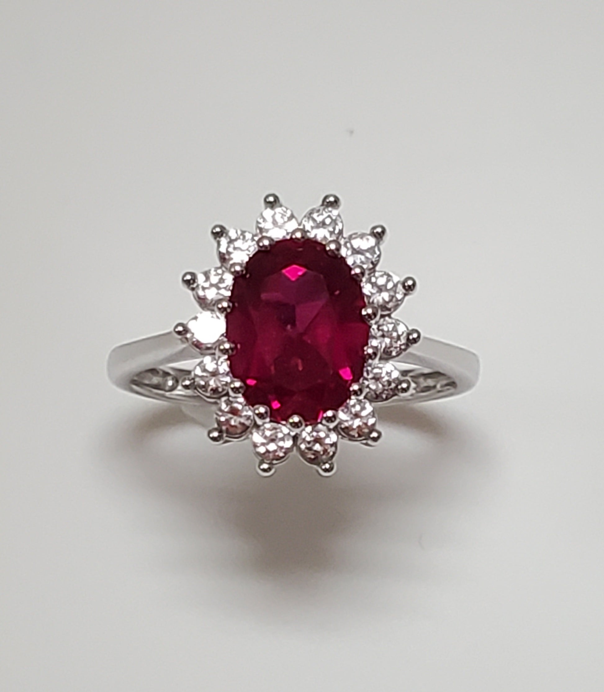 10k White Gold Ring with Created Oval Ruby and Created White Saphires