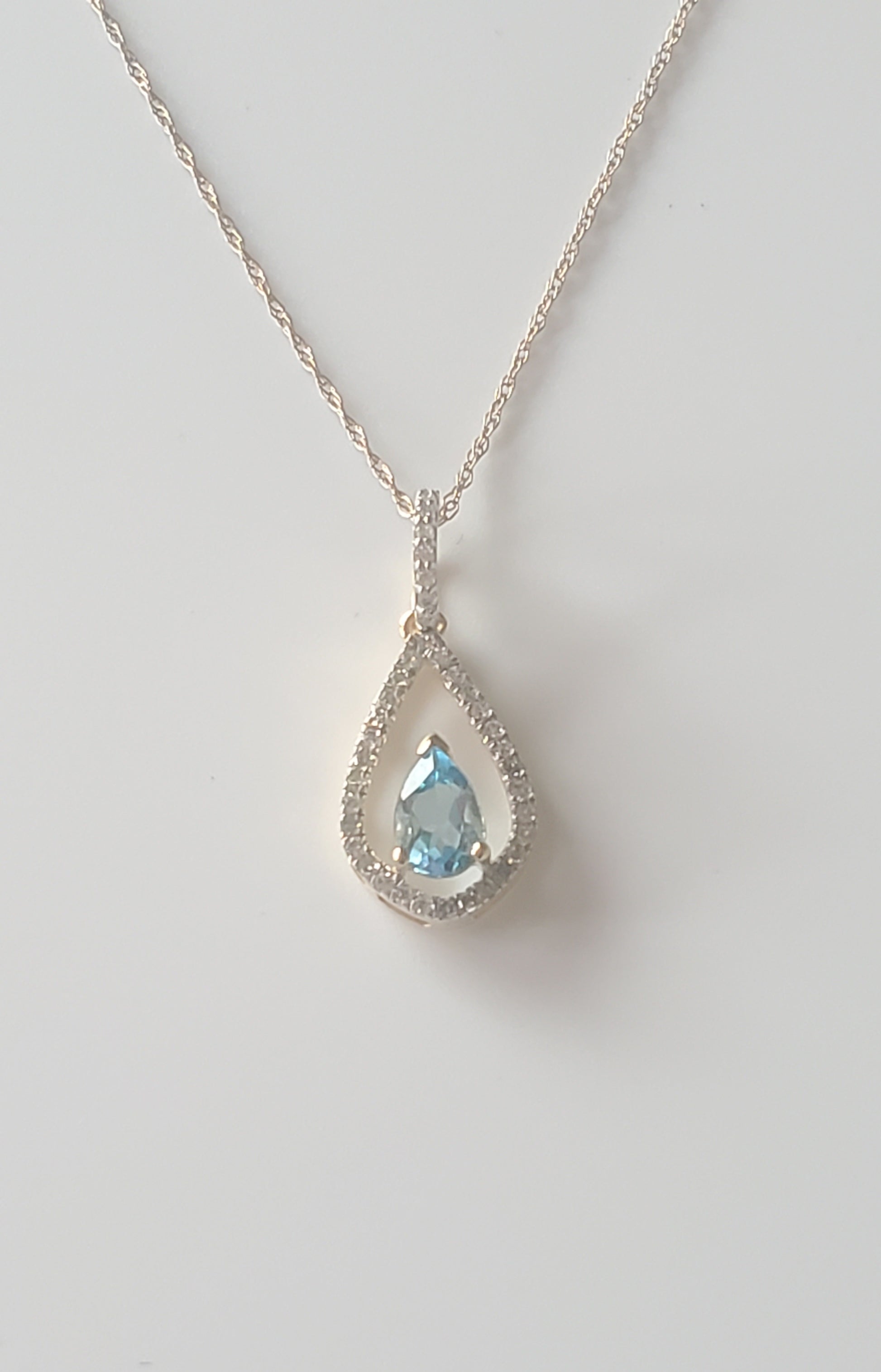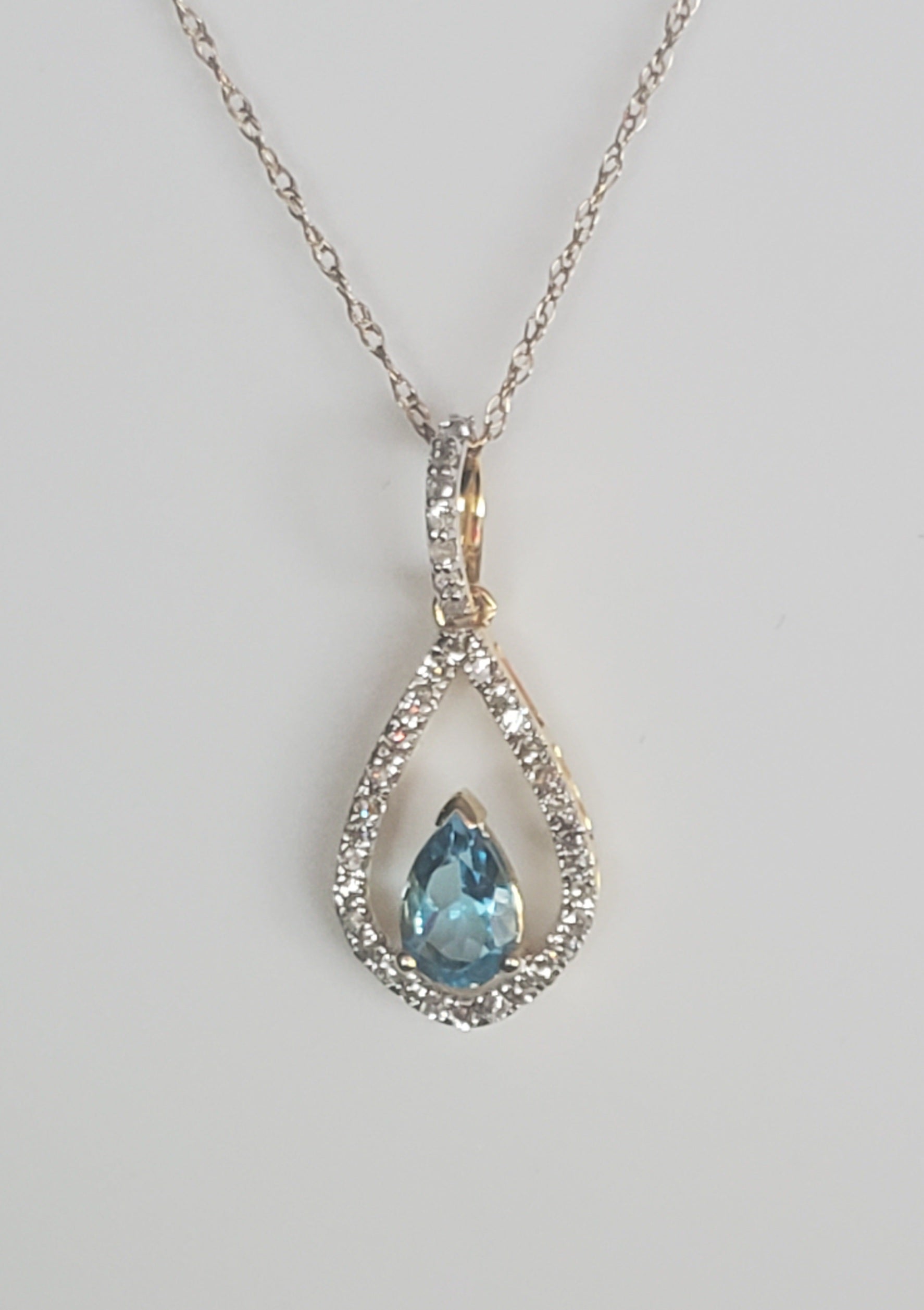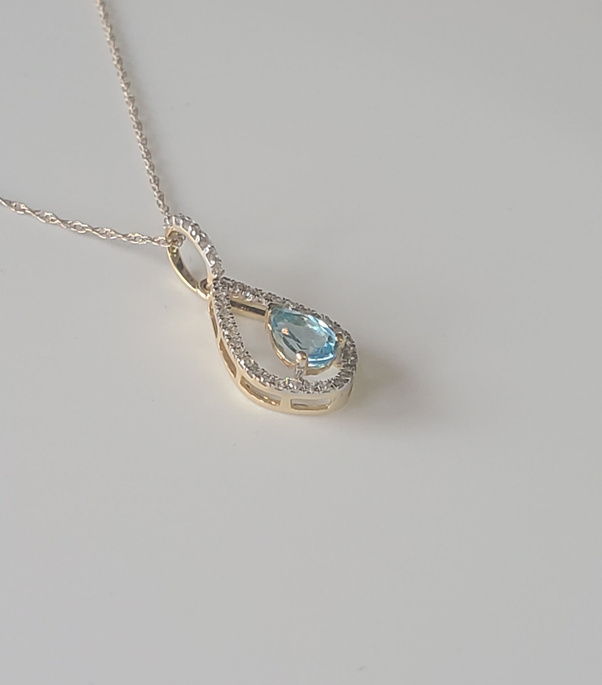 10k Yellow Gold Diamond and Blue Topaz Teardrop Pendant with 18" Chain. Diamond weight totaling .20 carats.